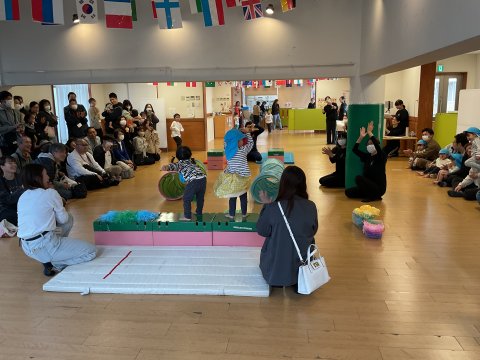 きりん組さんはかけっことダンス。お父さんお母さんと離れ心細くなったのか顔をこわばらせるこどももいましたが、大勢の前に立ち披露する事が出来ました。