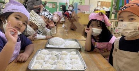 ひまわり組のみんなはおもちをついたあと、鏡餅を作りました。