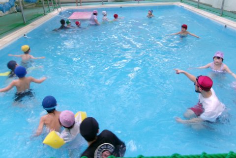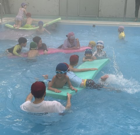 ばら組、ゆり組がお昼寝している間、ひまわり組は温水プールに入りました。